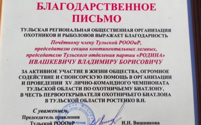 Председатель Тульского регионального отделения партии "РОДИНА" Владимир Ивашкевич принял участие в организации и проведении XV Чемпионата Тульской области по охотничьему биатлону, посвященного Дню Защитника Отечества.